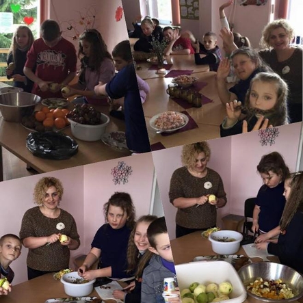 Draugystės salotų gaminimas ir bendras susėdimas prie stalo, pokalbiai apie patyčias.