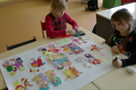 Pirmų klasių mokiniai po pamokų kūrė bendrą draugystės plakatą, kuris papuošė mokyklos sieną.