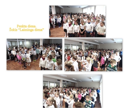 Susirinkome mokyklos aktų salėje užbaigti savaitės BE PATYČIŲ. Visi draugiškai šokome "Laimės" šokį.
