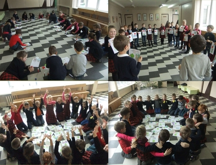 Plungės Senamiesčio mokyklos 1c klasės mokiniai ir mokytoja Regina Gusčienė kuria "Draugystės knygą".