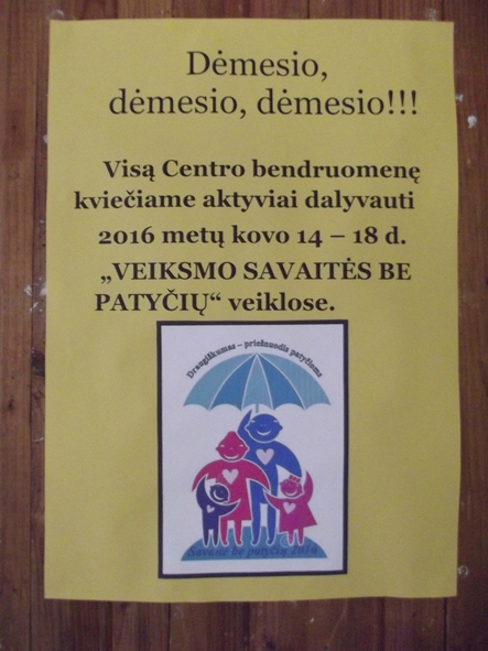 Kvietimas dalyvauti "Veiksmo savaitėje be patyčių"visai Centro bendruomenei.