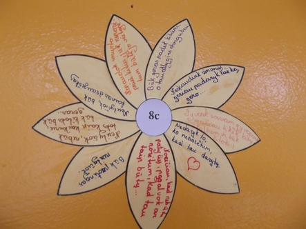 8c klasės mokoniai gyvenimo įgūdžių pamokos metu kartu su Jaunimo skyriaus vedėja G. Stasytiene savo gražiausius palinkėjimus visiems Centro bendruomenės nariams surašė į ramunės žiedlapius ir sukūrė pirmą pavasarinį žiedą, kuris papuoš trečio aukšto sieną, kurioje visą savaitę bus kūriamas koliažas.