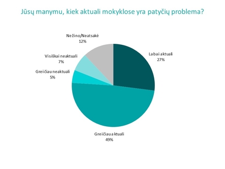 Pripažindami, kad skaudžios patyčios tarp vaikų ir paauglių yra svarbi problema, apklausoje dalyvavę suaugusieji mokyklų gebėjimą spręsti patyčių problemą įvertino vidutiniškai (6.3 balo skalėje nuo 1 iki 10). „Didėjant visuomenės supratimui apie patyčių priežastis ir pasekmes, auga poreikis diskutuoti apie efektyvius patyčių prevencijos ir reagavimo į patyčių situacijas būdus mokyklose. Apklausa atskleidžia, kad suaugę žmonės mato mokyklą kaip vidutiniškai gebančią spręsti patyčių problemą. Kai kuriose mokyklose išties vis dar stinga sistemingo ir visą bendruomenę įtraukiančio požiūrio į patyčių problemos sprendimą, taip pat trūksta nuoseklaus efektyvių prevencinių programų diegimo, – pastebi „Vaikų linijos” psichologė Jurgita Smiltė Jasiulionė. – Akivaizdu, kad dabar svarbu drąsinti suaugusiuosius pastebėti ir reaguoti į patyčias, suteikti vaikams pagalbą patyčių situacijose ir stiprinti supratimą, kad už vaikų saugumą mokykloje visų pirma yra atsakingi būtent suaugusieji.“