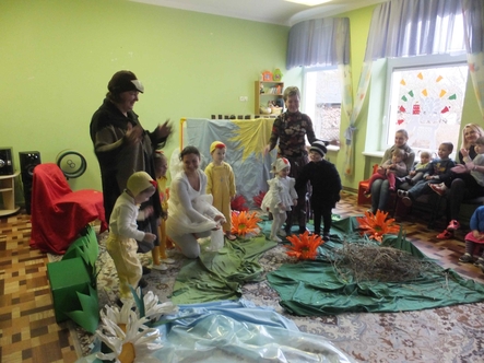Auklėtojos ir vaikai vaidino spektaklį ..Bjaurusis ančiukas", kuriuo stengėmės vaikus išmokyti garbingai elgtis su visais, nesvarbu ar jie gražūs, ar dideli, ar maži - svarbu-draugystė.