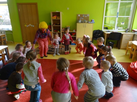 Draugiškasis klounas keliauja su vaikučiais padraugauti su bendraamžiais.