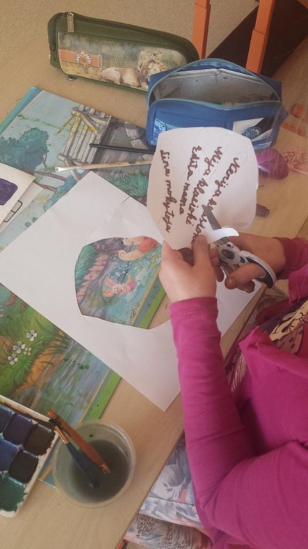 Su 2-3 klasių mokiniais analizavome įvairias situacijas, diskutavome ir bandėme atskirti, kada patyčios, kada - erzinimas, aptarėme žmones, į kuriuos galime kreiptis pagalbos. Savo rankutėse juos ir užrašėme.
