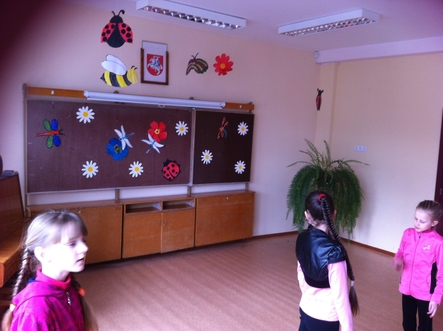 Mokiniai kirpo spalvino gėles, drugelius juos kabinome klasėse