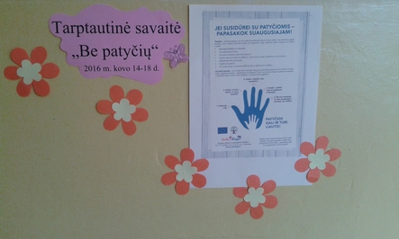 Mokyklos foje buvo skelbiama Vaikų linijos informacinė-metodinė medžiaga patyčių prevencijos tema.