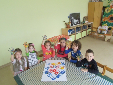 „Draugystės rankyčių“ dieną vaikai dailės studijoje kūrė rankyčių plakatus, kuriuose mirgėjo įvairiaspalviai antspaudų miražai. Visų grupių vaikų kūriniai puošia lopšelio darželio koridoriaus koloną, kurią pavadinome „Draugystės rankyčių šokis".