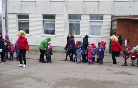 „Draugystės šypsenos“ dieną vaikus lauke pasitiko du smagūs linksmučiai iš „Linksmučių" šalies (auklėtoja R.Butavičienė ir socialinė pedagogė R.Vizgaudienė). Veikėjai vaikus pamokė, kaip pasisveikinti su draugais, kaip apsikabinti ir tiesiog pabūti kartu, padainuoti, pašokti. Pasivažinėję spalvotu garvežiuku vaikai padarė didelį linksmą, besišypsantį veiduką. Juk vaikų šypsena - didžiausias džiaugsmas. Linksmučiai visiems vaikams palinkėjo būti draugiškiems, papuošė vaikų veidukus šypsenų lipdukais ir iškeliavo atgal į linksmučių šalį.