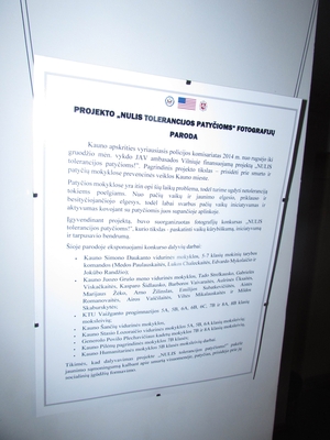 Kauno apskrities VPK Viešosios policijos pastate atidaryta moksleivių fotografijų „NULIS tolerancijos patyčioms“ paroda. Parodoje eksponuojamos moksleivių fotografijos iš Simono Daukanto, Kovo 11-osios, Stasio Lozoraičio vidurinių mokyklų, Juozo Grušo meno vidurinės mokyklos, KTU Vaižganto progimnazijos, Generolo Povilo Plechavičiaus kadetų mokyklos, „Pilėnų“, Humanitarinės pagrindinių mokyklų, Bernardo Brazdžiono mokyklos.