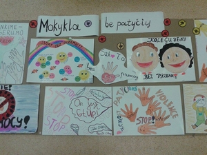 Visą savaitę mokiniai piešė plakatus "mūsų mokykla be patyčių", vakar mokyklos mokinių tarybos nariai išrinko gražiausius ir temą atskleidžiančius plakatus ir piešinius. Gražiausi plakatai buvo iškabinti mokyklos stende "Mokykla be patyčių".