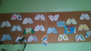 Sparnai, kurie papuošti mokinių sukurtomis draugiško bendravimo klasėje ir mokykloje taisyklėmis