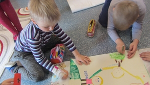 Šėtos socialinio ir ugdymo centro visuomenės sveikatos priežiūros specialistė Simona pasiūlė pavaizduoti plakate kaip vaikai jaučiasi, atėję į darželį. "Pelėdžiukų" grupės ugdytiniai mielai ėmėsi piešti save besišypsančius ir kai kurie net užrašė savo nuotaiką.