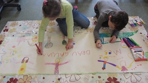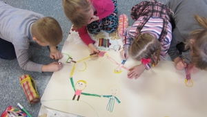Baigiamas piešti draugų ratelis. Bendras piešinys su užrašu "Mes draugaujame" kabės ant sienos grupėje.