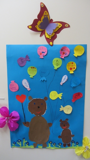 Vaikų ir tėvelių parengtas plakatas "Draugystės balionėliai" su gera nuotaika pasitinka visus ateinančius į darželį.