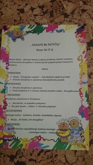 Vilniaus l/d "Vėtrungė" akcijai "Savaitė be patyčių" surengta draugystės plakatų paroda, piešinių paroda, vaikai salėje žiūrėjo mokomąjį filmuką apie draugystę ir animacinį filmuką "Didžiausias draugas", juos aptarinėjo su meška, diskutavo ir dalinosi mintimis.
